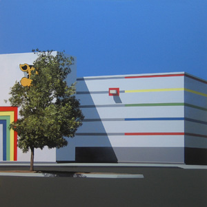 San Francisco-based artist Jake Longstreth's new exhibition, Wabi Ranch, presents paintings inspired by ubiquitous, commercial settings. The once grand idea of the open, western ranch tended by cowboys has shifted to more commonly refer to ranch houses and "ranch"-flavored Doritos. The landscapes Longstreth depicts are the legacy of this transformation-a world having more in common with branded franchises than the open range. These flat, light-filled works engage the landscape not in an idealized or censorious way-but rather, with a conscious acceptance of the unremarkable nature of the subject matter.