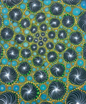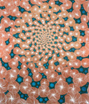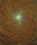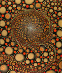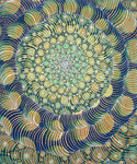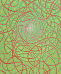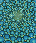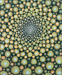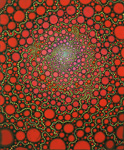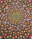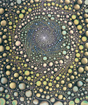 Barbara Takenaga’s expansive visual palette is full of dense abstractions. Peppered with discrete elements which radiant and spiral outward from a central vanishing point, and dots, lines, and orbs that dance across the surface of her paintings like variables in an elegant calculus, Takenaga’s pieces radiate with an aura of whimsy and the unknown. Dazzling, circus-like colors ignite, expand, and contract against muted backdrops—rendering a hallucinogenic power similar to the psychedelic optical art of the 60s. Her perfectly calculated shapes also approximate the uniformity of fractals and microscopic organisms. Takenaga’s deftly conveyed sense of cosmic grandeur is especially potent in her Night paintings, which depict the wonder and awe that result from scrutiny of the nighttime sky.