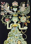 Gregory Lind Gallery is proud to present Entwined with the Vine, a solo show by artist Jovi Schnell, composed of gouache works on paper, panel, a mobile, and collaged wood cut-out paintings. In this body of work, Schnell's deft and playful fusion of biology, physics, technology, spirituality, myth, and narrative is the basis of her holistic backdrop, as she examines human relationships to culture, history, nature, language, desire, and invention. Schnell's pieces can be seen as both microcosmic and macrocosmic, as they serve as symbolic explanations of the inner life juxtaposed against the external world.