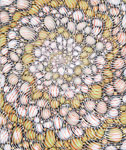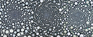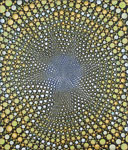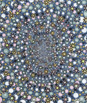 With a spare lexicon of radial symmetry, dots, and lines, Takenaga creates dense pieces imbued with surfaces that are both palpable and dimensional, in which patterns simultaneously come together and break from the whole, and serenity and discord inhabit the same space. Takenaga's vividly imagined, self-contained realms are populated with dots of bright color-akin to everything from molecules to fractals to celestial cluster formations-which map a route to a distant, primal center. Although they may appear, at first glance, to be divorced from a cultural or human context, these tiny elements reference Op Art, DNA modeling, textile patterns, and computer-generated simulacra, and reflect the renewed interest in abstract painting and its relationship to science and nature.