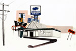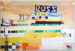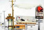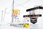 Wozniak's work translates the language and symbolism of development to remarkable effect. Fast food, car dealership and lodging signs loom above the land; these placards and billboards are symptomatic of cookie-cutter development and the lures of tourism and consumerism. As telephone poles visually collide with shops, chain restaurants, and bursts of occasional foliage, Wozniak also manages to construct a subtle commentary around those elements missing in her work-natural landscapes and the disappearing vernacular of the nation's open roads.