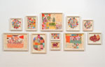 Acrylic, gouache, spray paint on wood, canvas and gourds