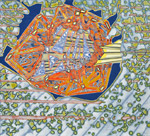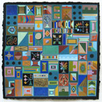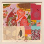 Acrylic paint, block printing and collage on cut paper