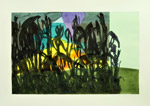 Acrylic, gouache, spray paint, graphite, leaf, collage, thread on paper