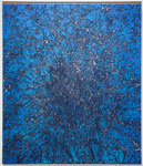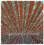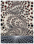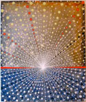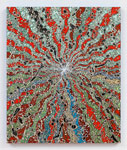 In works such as “Blue Haze,” a kaleidoscopic terrain of undulating metallic dots is suggestive of celestial objects. “Minus Red” presents a feverish yet contained explosion of rays of color against a backdrop of a primal, amorphous fog, before melting into a vermillion event horizon of perceptual space. Takenaga’s repeated shapes are balanced by the exuberance of her compositions. While her work has been referred to as “psychedelic,” this is sensory profusion that never becomes visual overload. Her painstaking precision and references to larger processes in nature are, then, an apt visual metaphor for the cosmic energies that pervade our space in both obvious and undetected ways.