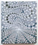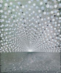 Takenaga has expanded on her lexicon of simple shapes – dots, lines, circles, and undulating wave patterns of varying scales – with the inclusion of a flat line that is both horizon and division. In this series, Takenaga includes her signature light-saturated, reflective surfaces and an opalescent palette of pulsing color schemes that often radiate out from a vanishing point in multifarious swirls, evoking landscapes and mirrored images.