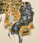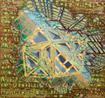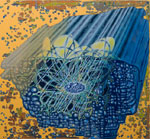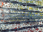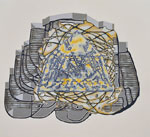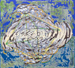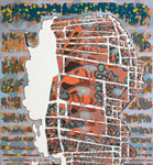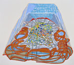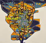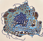 Walker’s unusual process-oriented techniques underscore the visual multiplicity of her paintings. Working with layers of acrylic paint that are by turns poured, pooled, filled and wiped away she uses the natural proclivities of the liquid medium to establish a rhythm of organic patterns that she fills with intricate geometric structures. A personal rule holds that nothing on any layer may ever completely vanish. As a consequence the works build relentlessly while ensnaring fragments of their history. Whether reservoir or memory bank each painting beckons the viewer to filter in not out the complexity of the world.