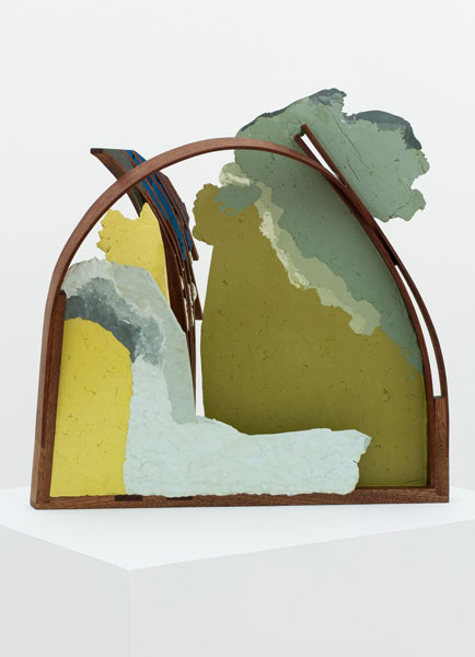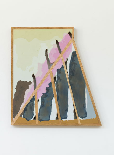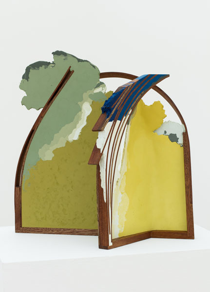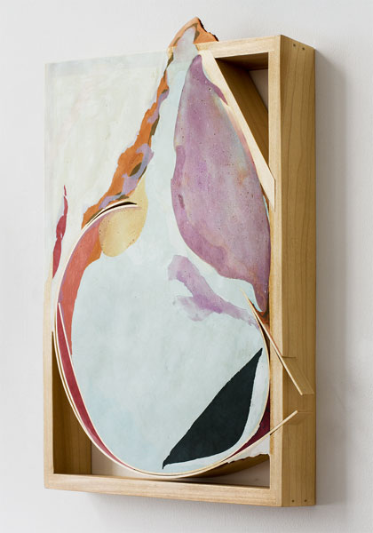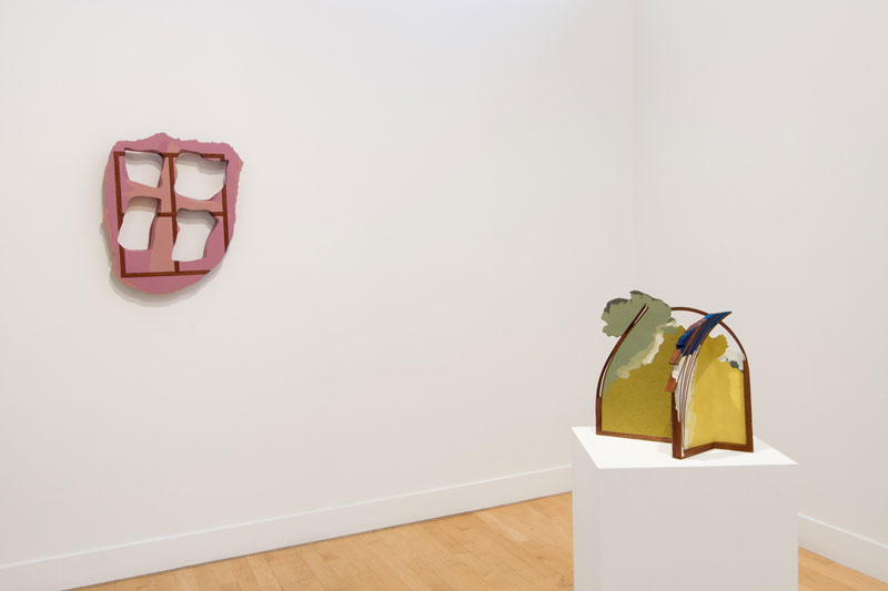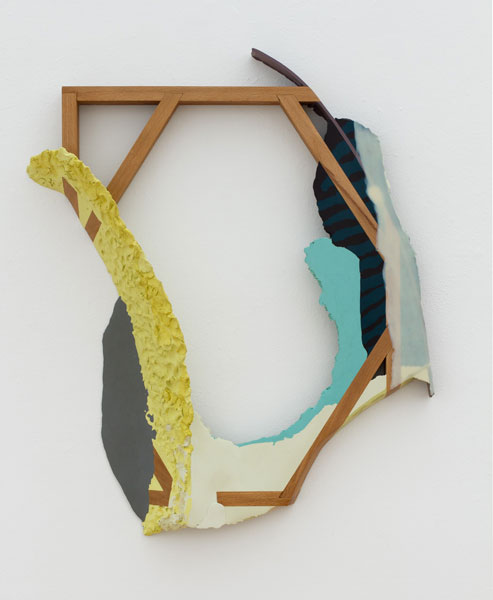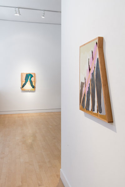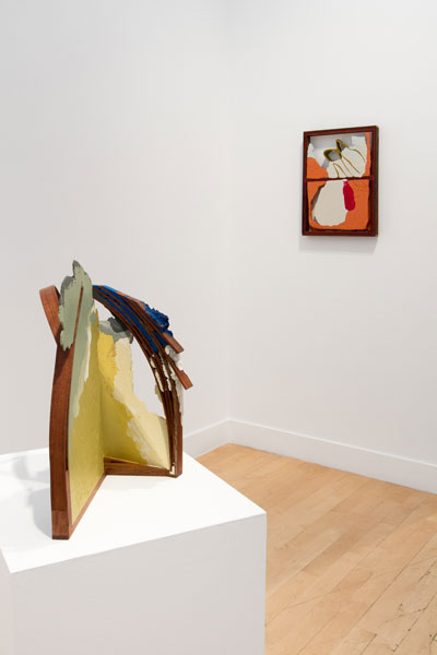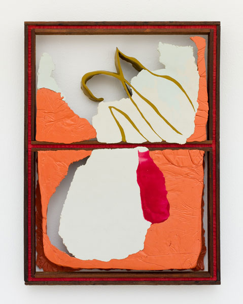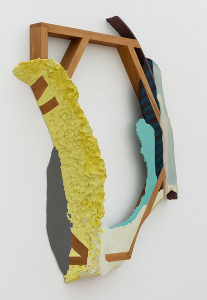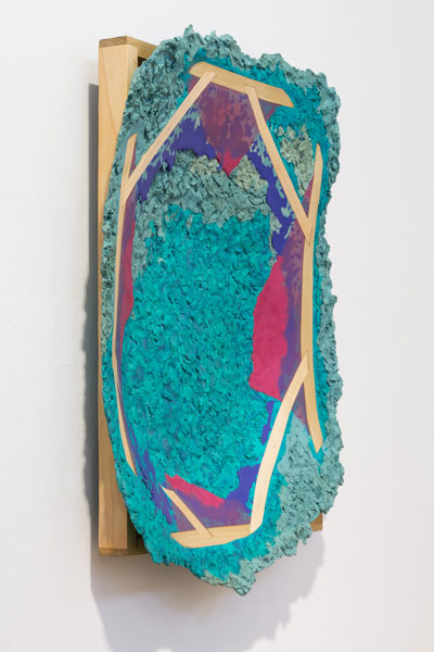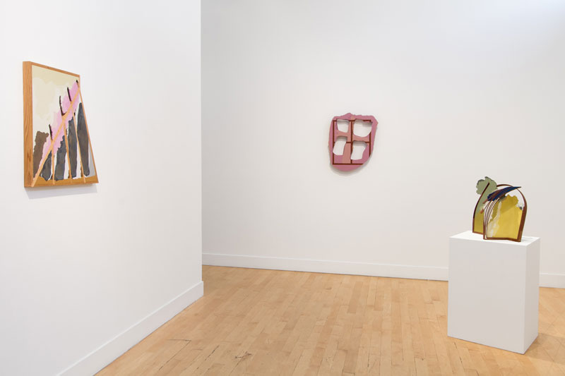 In his new body of work, Maychack exposes stripped-down forms, devoid of metaphors. This continuation of his Compound Flat series delves more deeply into the lexicon of painting through the construction of wall objects. In these pieces (constructed of epoxy clay, pigment, and wood), surfaces become places where physical and sculptural, abstract and pictorial space, intersect. In Maychack’s work, the wood and that of the pigmented resin often conflict, only to cohere back into a unified composition in successive moments. Because color is used to connect disparate elements across spatial voids, the voids themselves often act as positive space. The dichotomy between painting and sculpture places the viewer in a similar space of uncertainty.