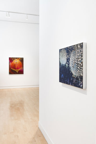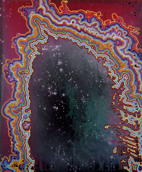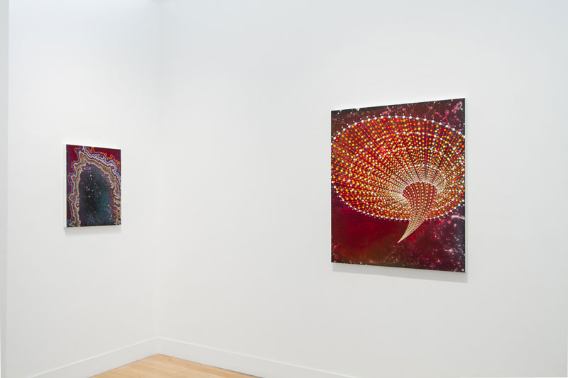 In the new work, Takenaga’s “faux Abstract Expressionist” backgrounds of paint splatters suggest compositions that range from obsessive patterning to vast natural landscapes to quasi-apocalyptic scenarios. Enticing the viewer with plays of massive and microscopic scale, the pieces easily move into the formless and conceptual—offering us an iconography of both inner and outer space. For instance, the painting “Aura/Arch” can be read as psychedelic vibrations around a doorway to night sky or the center of a stone geode. “Red Funnel II” can alternately be a tornado, spaceship, or twisted chandelier. The multiple interpretations engage spectators in a viewing experience that enables a single reading of the painting to open a portal into other possibilities.