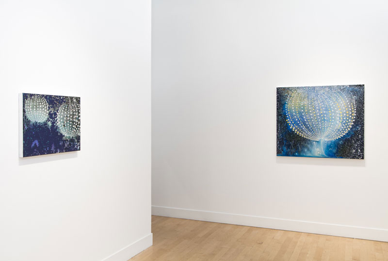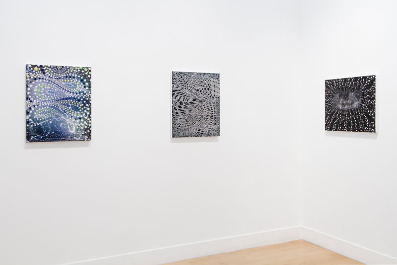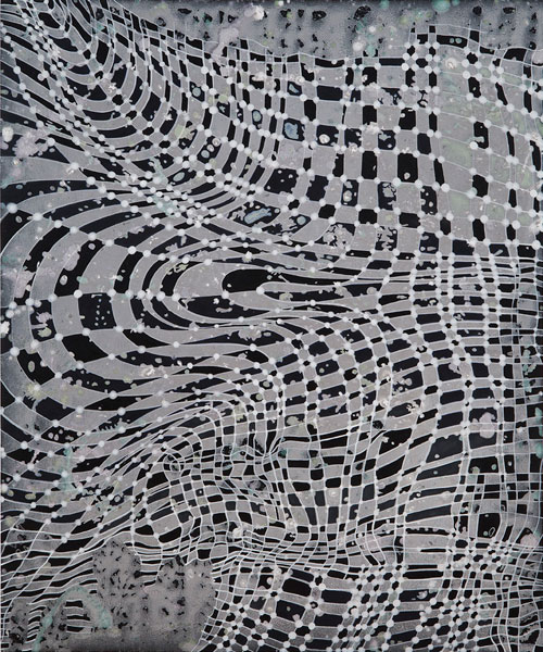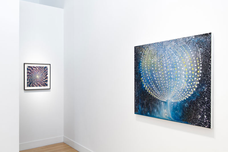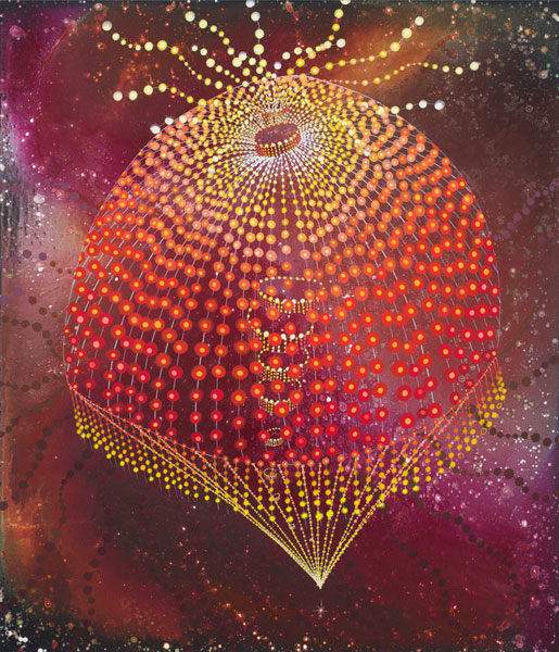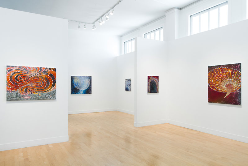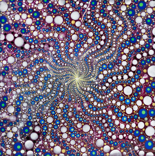 Repetition of radiating dots and horizon lines evoke motion and energy fields. Opposing methods of “fast work” (throwing and pouring paint over the canvas) and “slow work” (labor-intensive, detailed painting) give us insight into the contradictions and complementary methods inherent in the creative process.