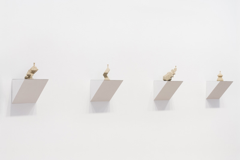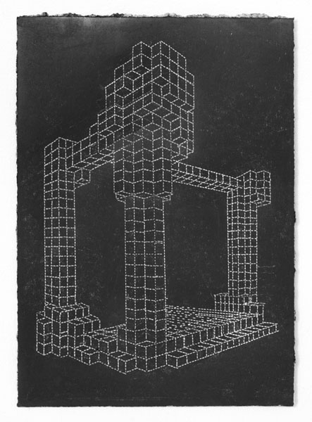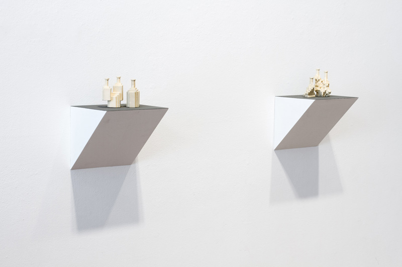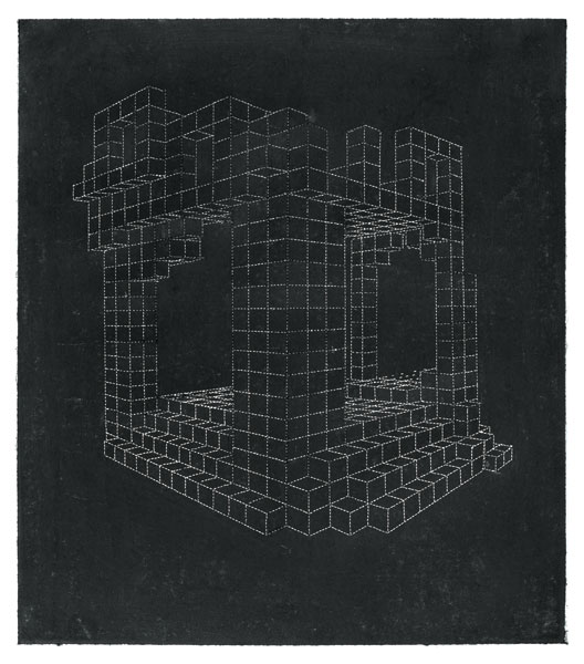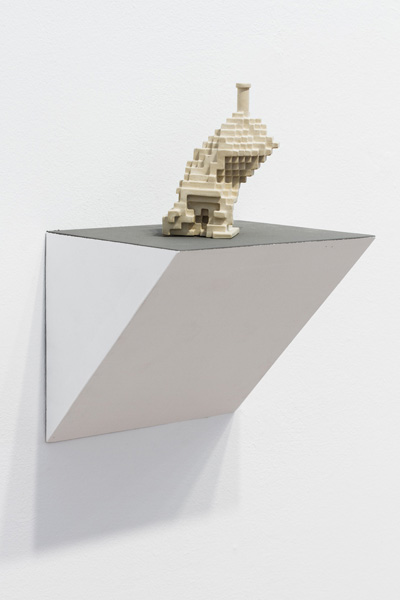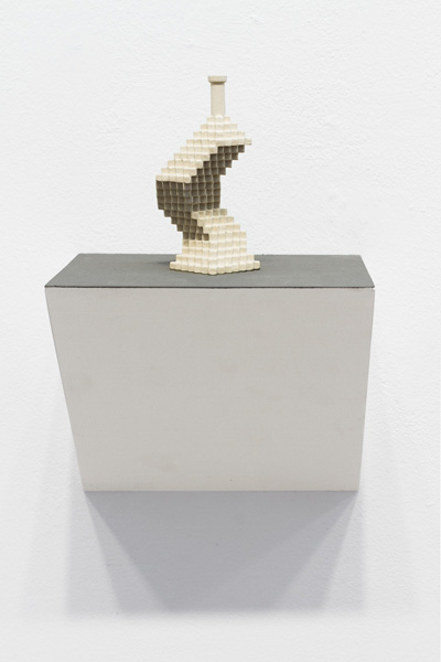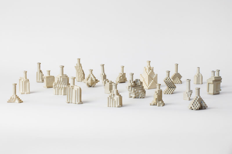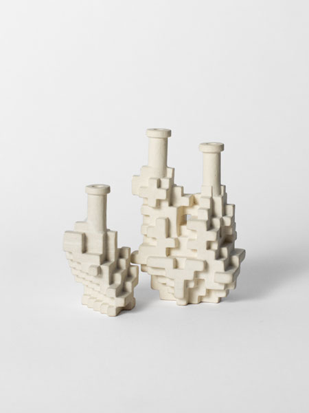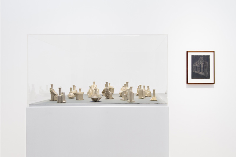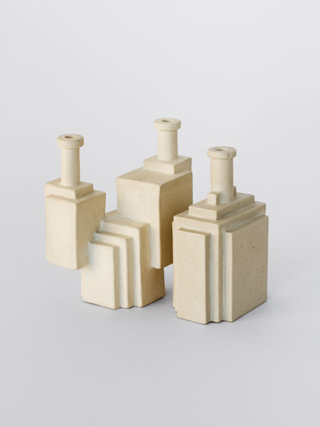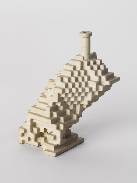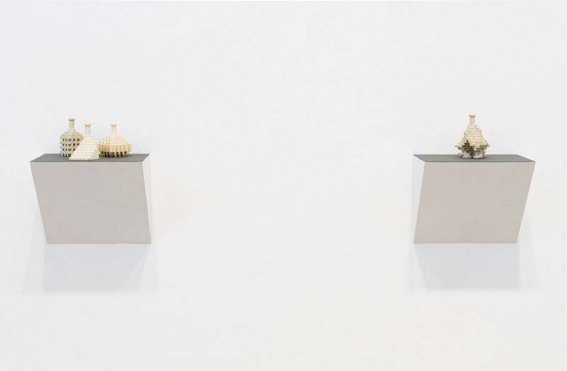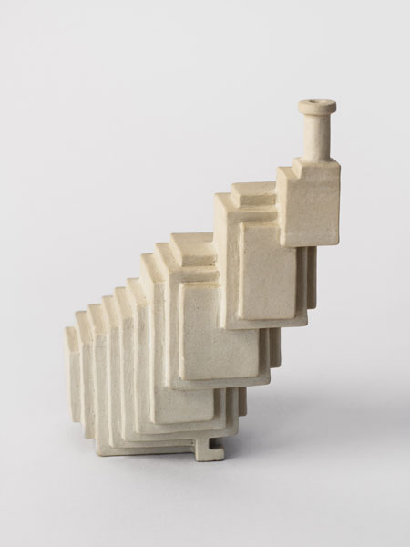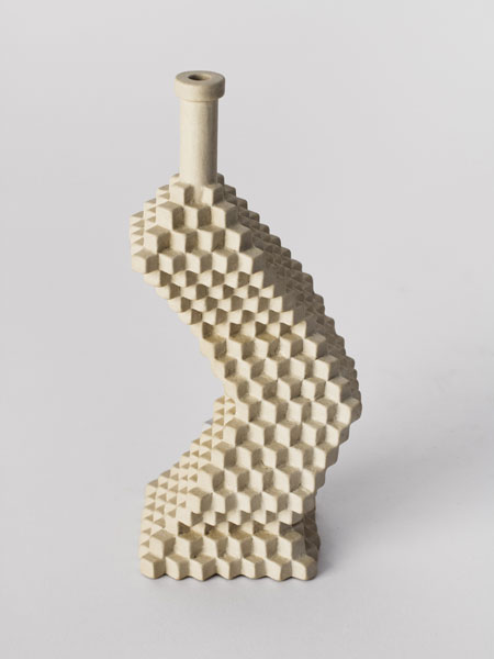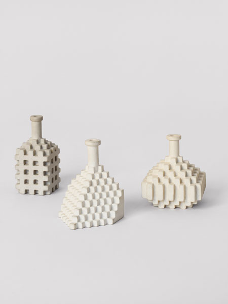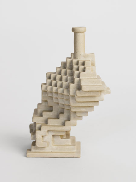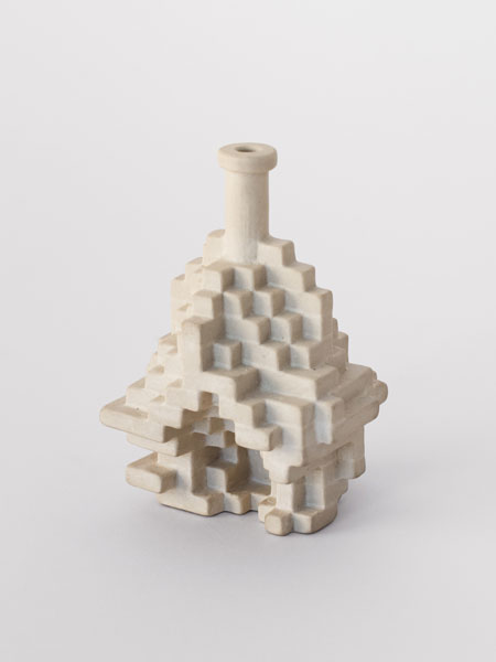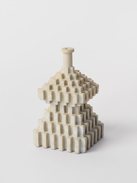 Will Yackulic’s Enigma Variations are portraits too, in their own manner. Clay flasks measuring little more than a few inches tall, the original twenty-one Variations transpose the personalities of the artist’s friends into constructions made of tiny cubes. A slender bottleneck rises at their tops like a smokestack on a model factory. Some of the Variations are assembled methodically, their stepped sides building into dramatic cantilevers. Others lose themselves in cubic warrens, giddy with complexity, or they develop asymmetrically, spontaneously sprouting up geometry.