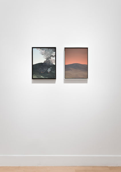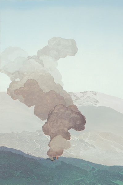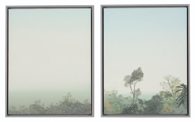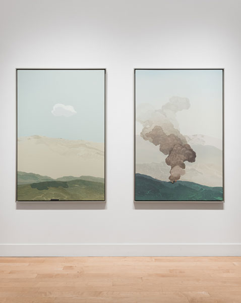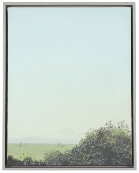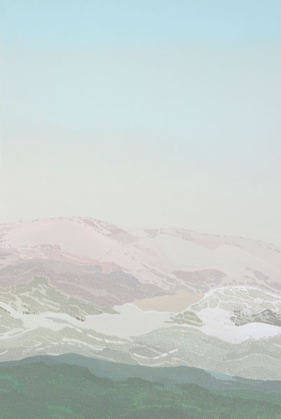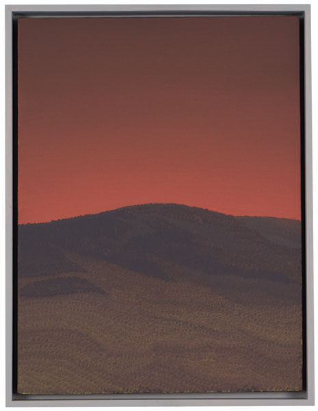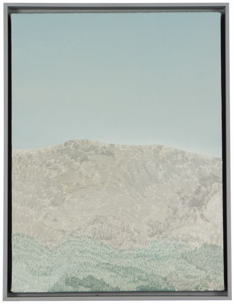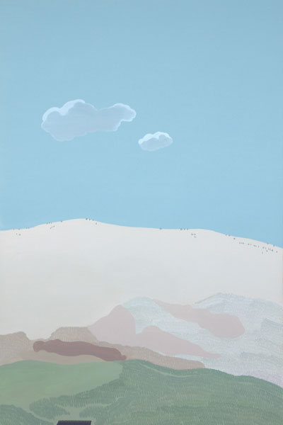 Longstreth’s early work comprises photo-based paintings extracted from the American landscape, depicting examples of corporate retail architecture; the works subtly recontextualize the purpose of these buildings and posit a keen exploration of the homogeneity of suburban environments. Although his interest in spare, stark scenes is a dominant thru-line in all his work, these pieces investigate pure landscapes, composed from memory and imagination. Longstreth’s topography and palette are derived from his experience living in Los Angeles and traveling through the vast terrain of the West. He contrasts sky and land in style and technique—composing open skies with a creamy, seamless spectrum of tones, and terrestrial elements such as trees and mountains from small, stuttering brushstrokes.