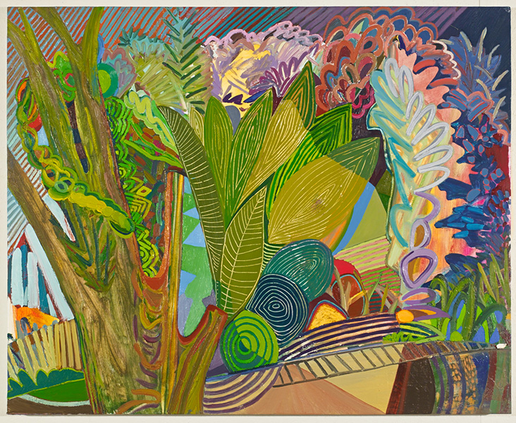 Flamboyantly composed and rendered, these paintings feel deeply personal. Taking the observed landscape as a starting-off point, these works form their own hallucinatory and fantastical world. They possess a visionary quality that links to a lineage of American painting running through artists like Arthur Dove and Charles Burchfield, where the landscape is a vehicle for imagination and emotional response.